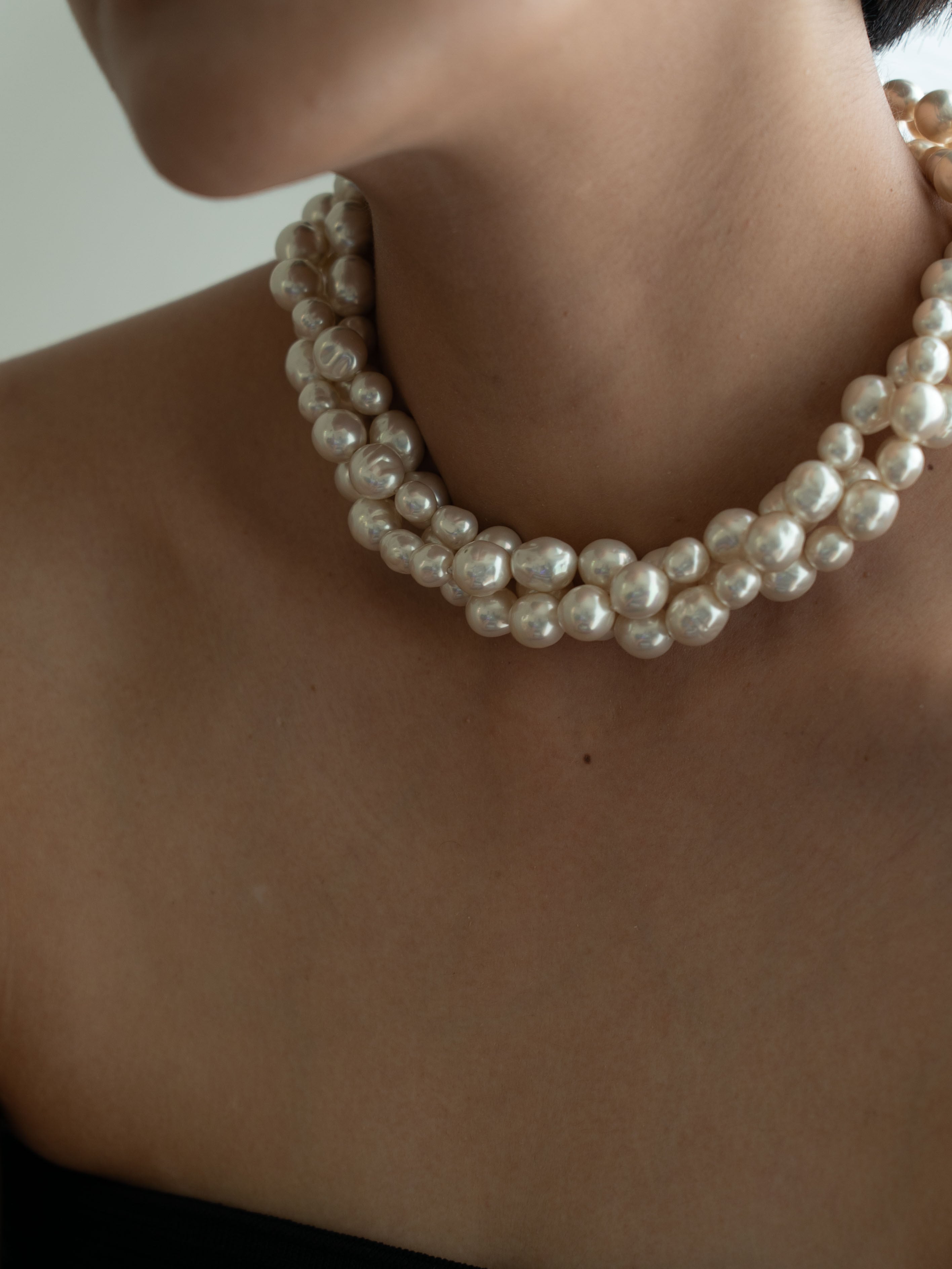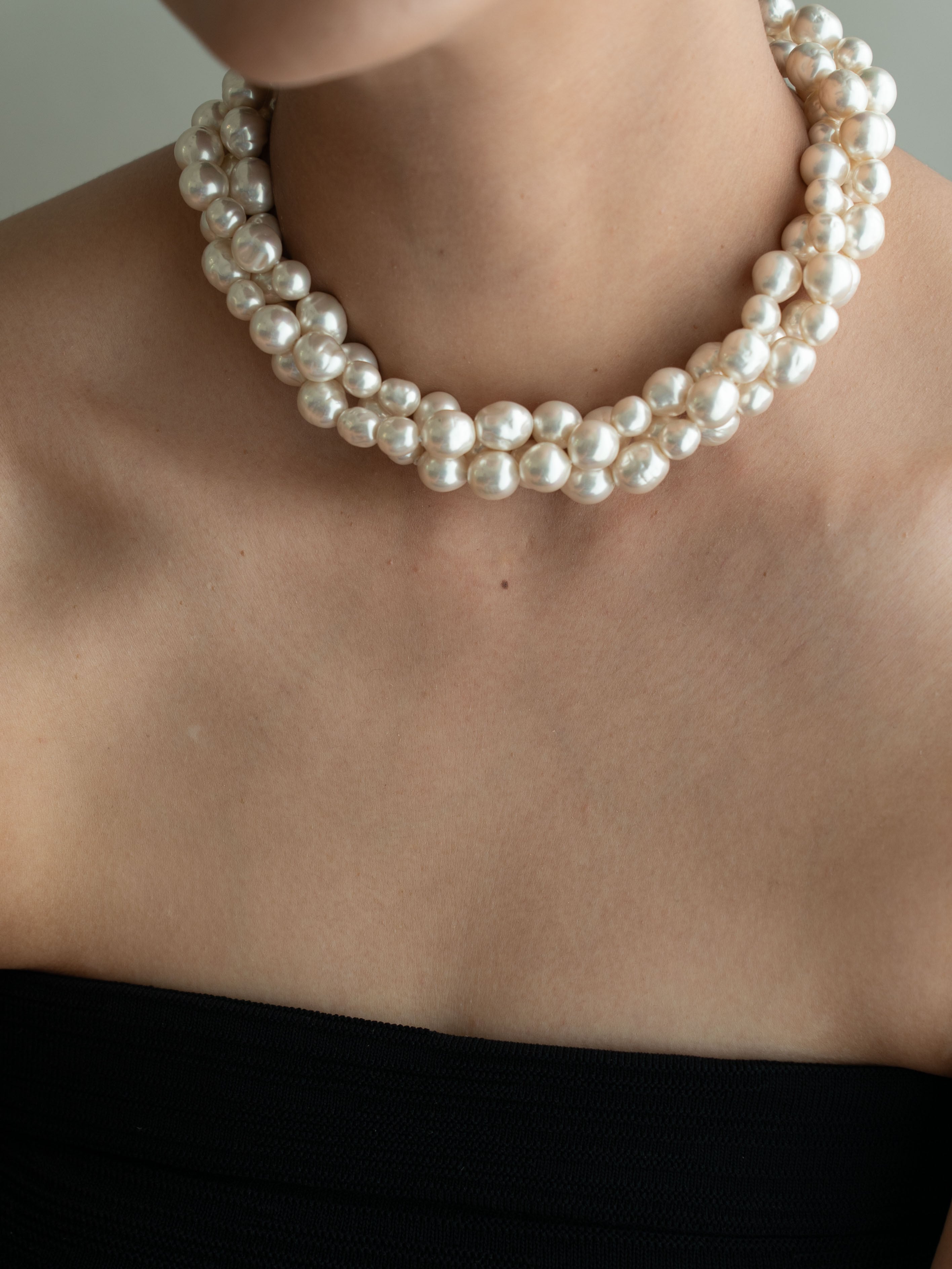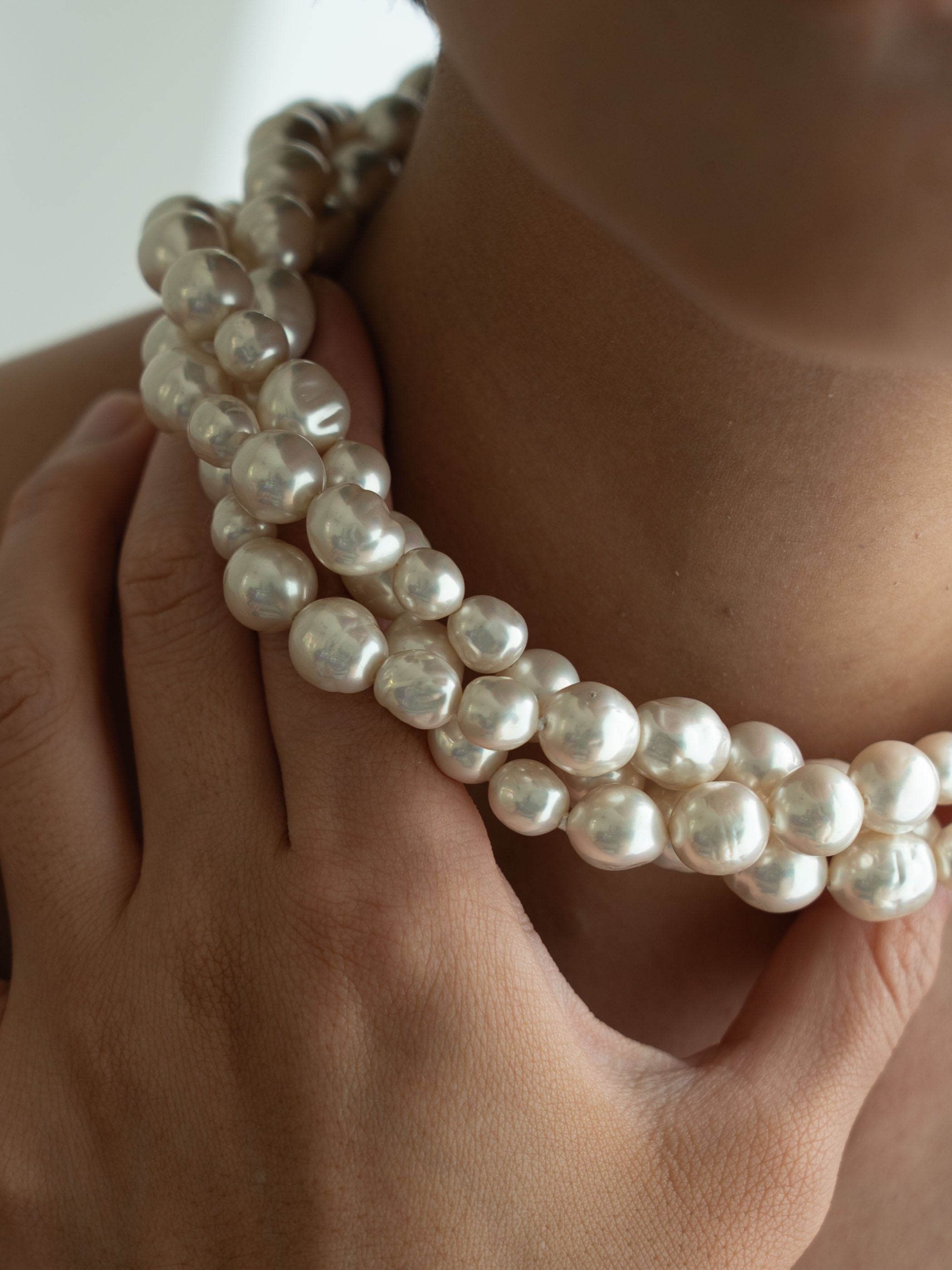 人気の多連パールネックレス。国内の職人により丁寧に作られたガラスパールは、普通のイミテーションパールとは違い、絶妙な色味と、ほんのりとした偏光があり、かなりリアルに近い質感です。傷がなく照りがしっかりとある大粒のものをを心置きなくふんだんに使用することができました。有機的なデザインのフッククラスプもデザインポイント。華やかなオケージョンシーンはもちろん、カジュアルなコーディネートに取り入れても素敵なアイテムです。