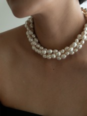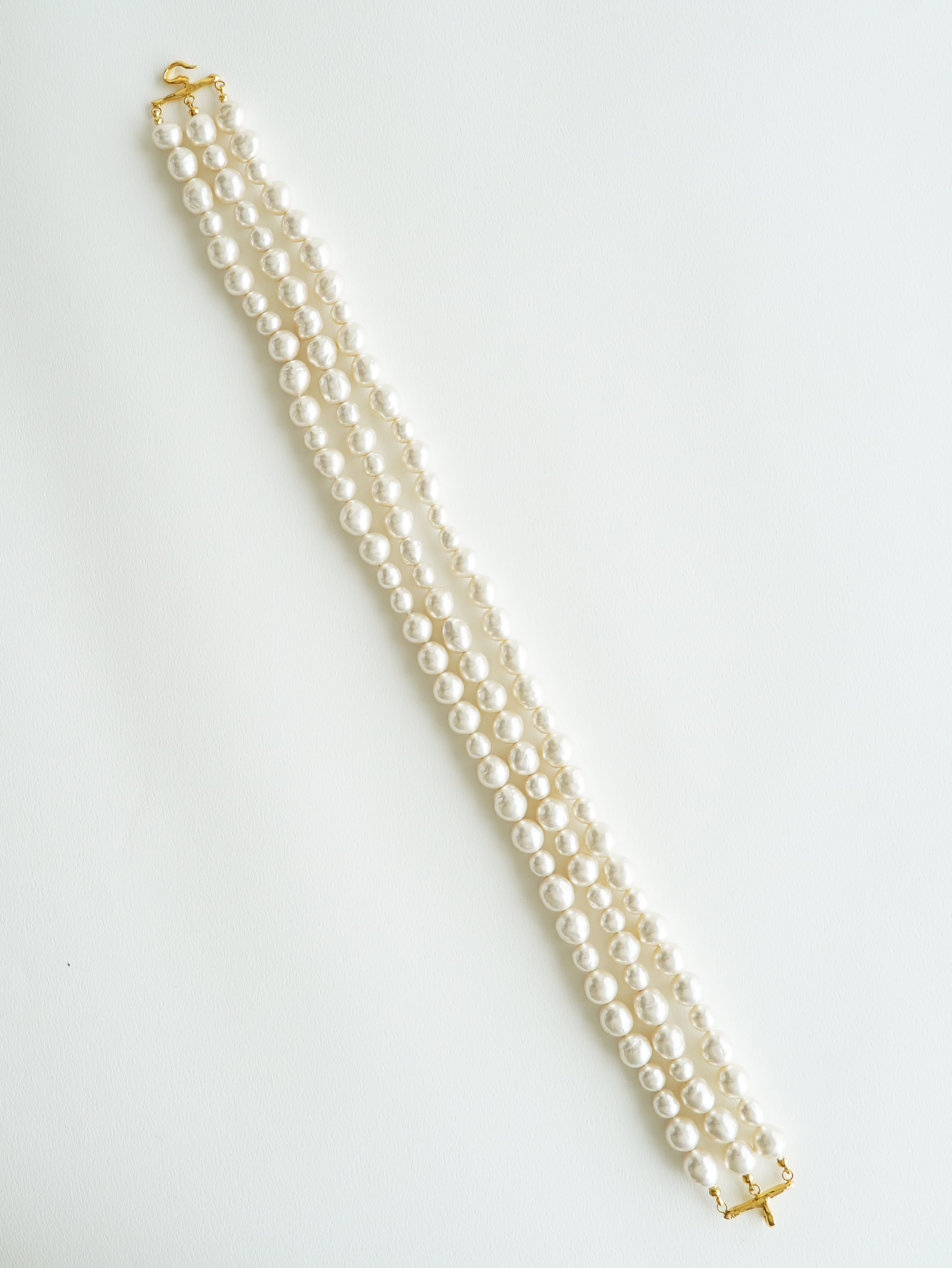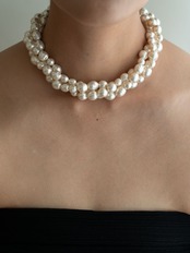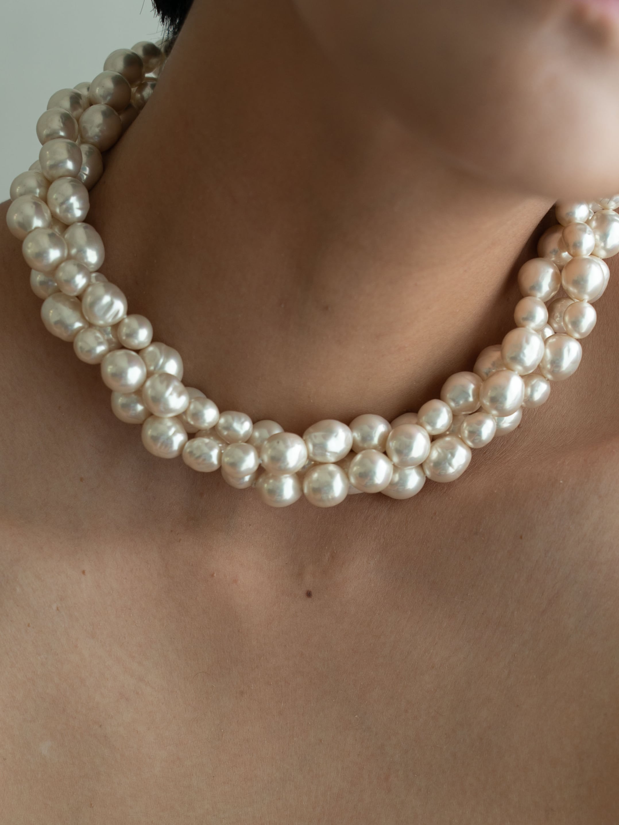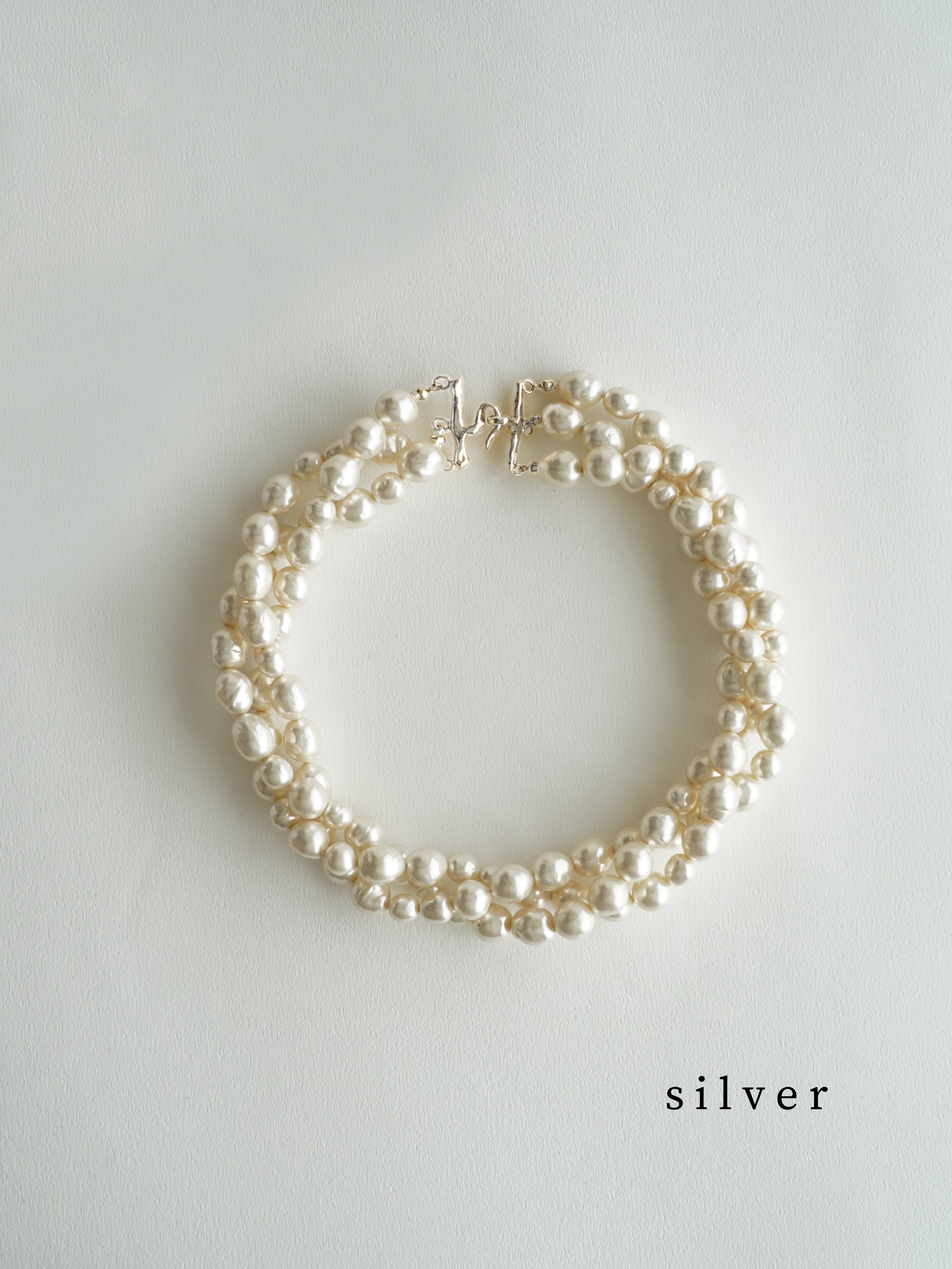 人気の多連パールネックレス。国内の職人により丁寧に作られたガラスパールは、普通のイミテーションパールとは違い、絶妙な色味と、ほんのりとした偏光があり、かなりリアルに近い質感です。傷がなく照りがしっかりとある大粒のものをを心置きなくふんだんに使用することができました。有機的なデザインのフッククラスプもデザインポイント。華やかなオケージョンシーンはもちろん、カジュアルなコーディネートに取り入れても素敵なアイテムです。