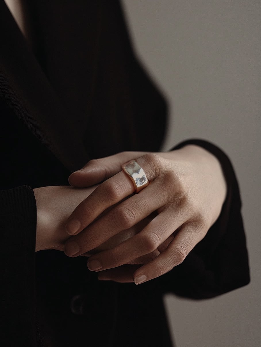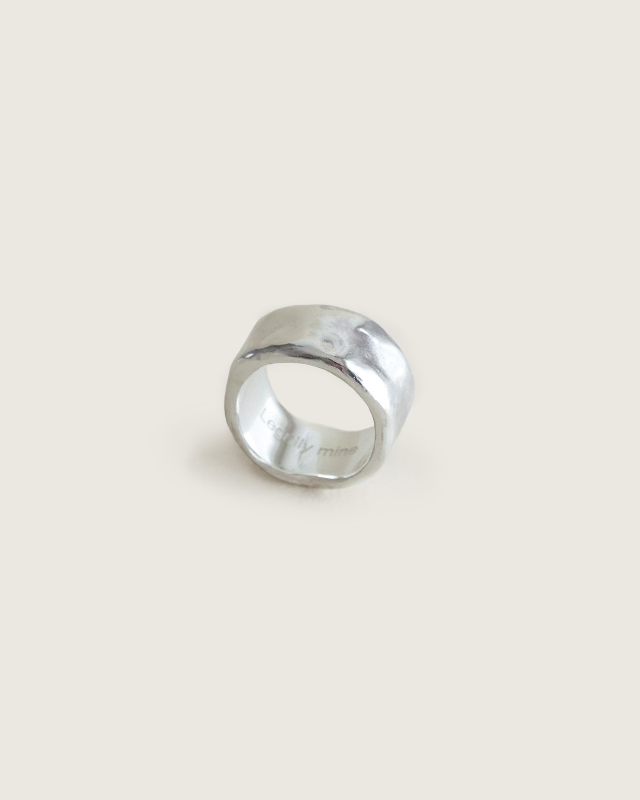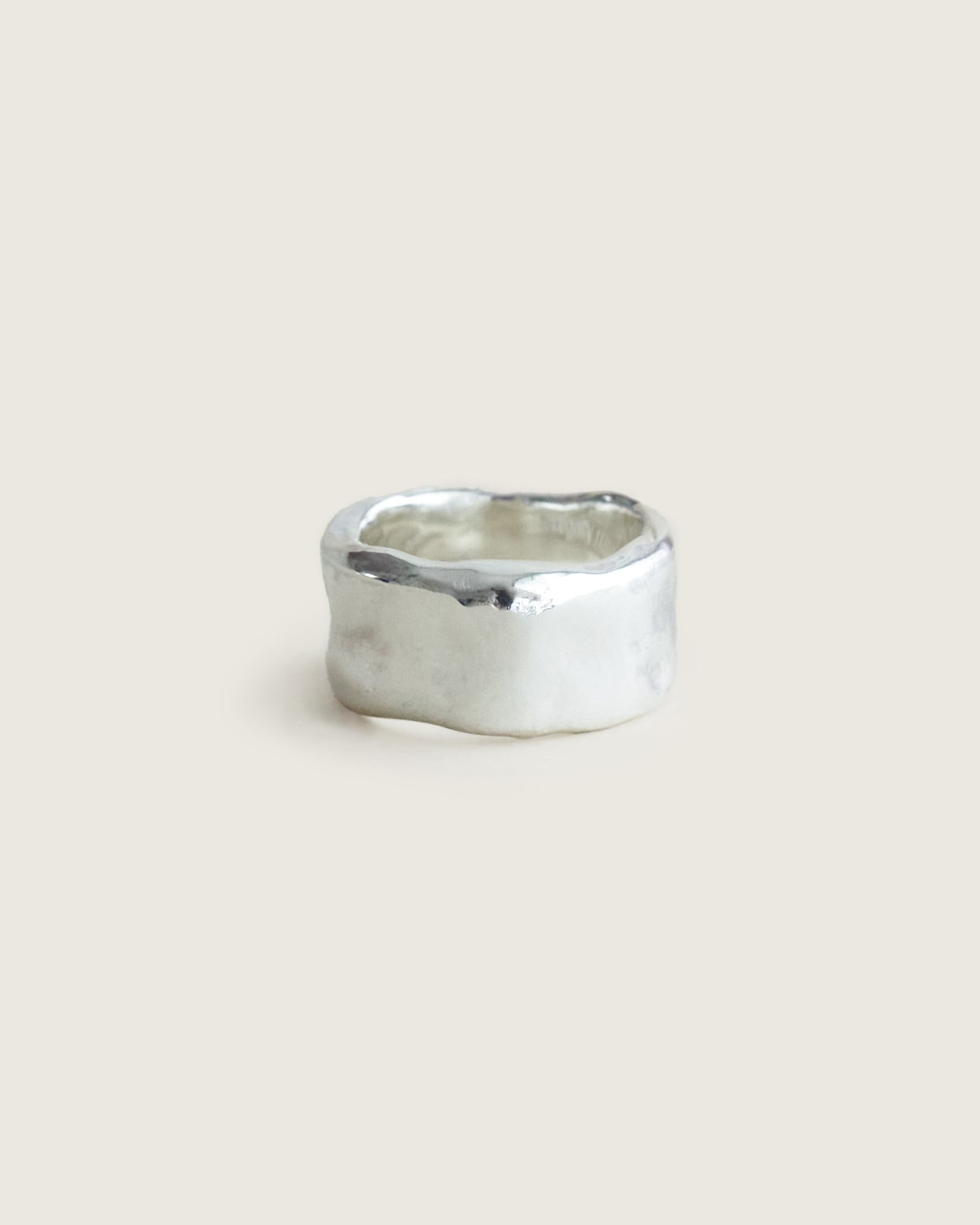 純銀を贅沢に使った、ボリュームと厚みのあるワイドリング。温かみのある陶芸作品のような雰囲気と、シルバーの硬質な輝きという相反する要素を持ったリングです。インパクトのあるデザインですが、意外とどんなスタイルにも馴染みやすいです。