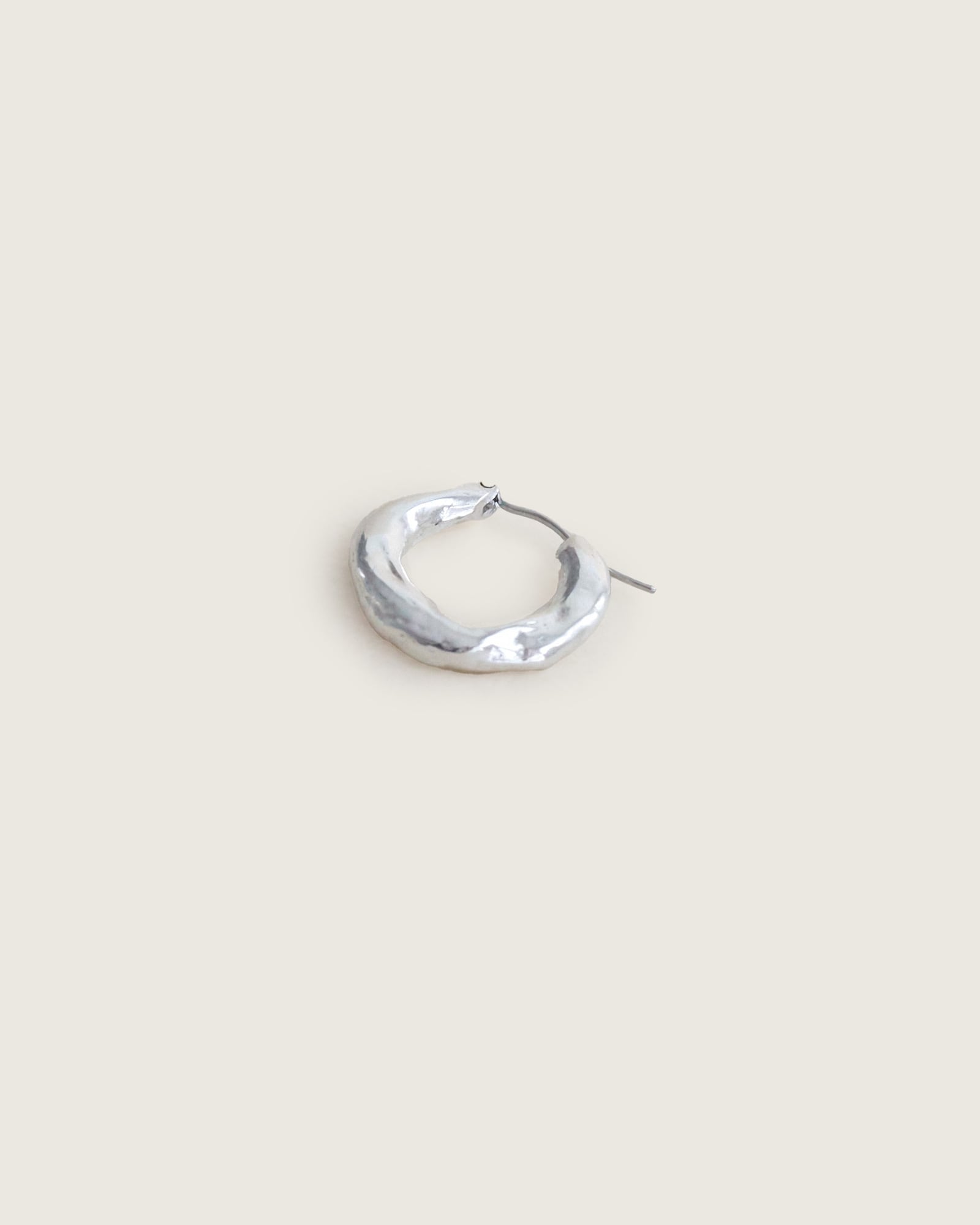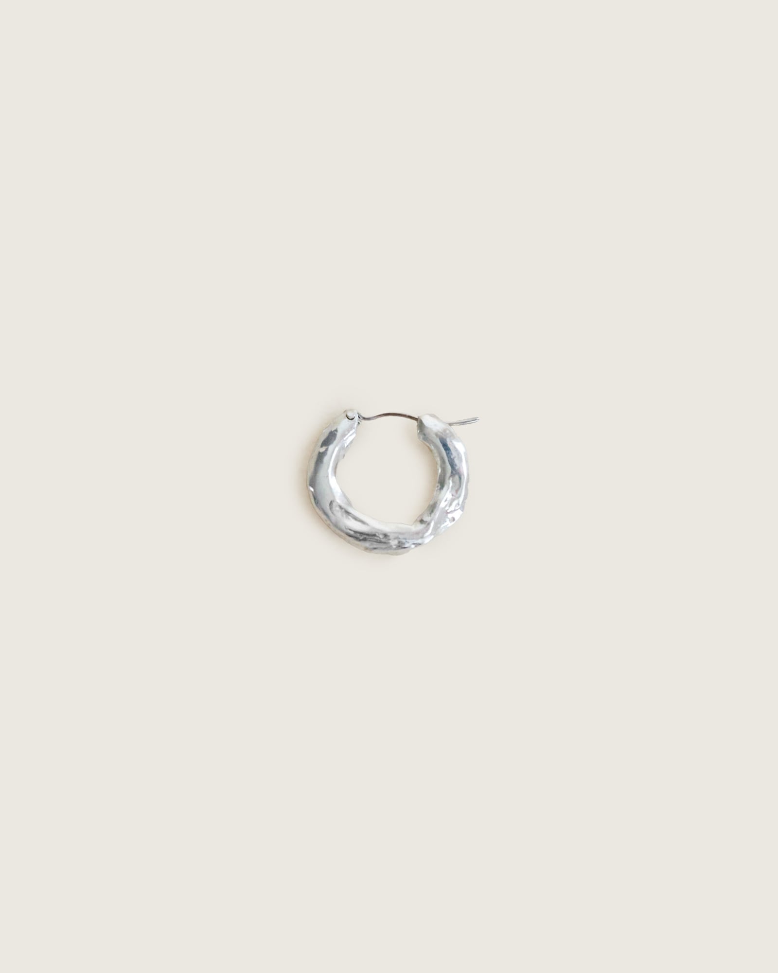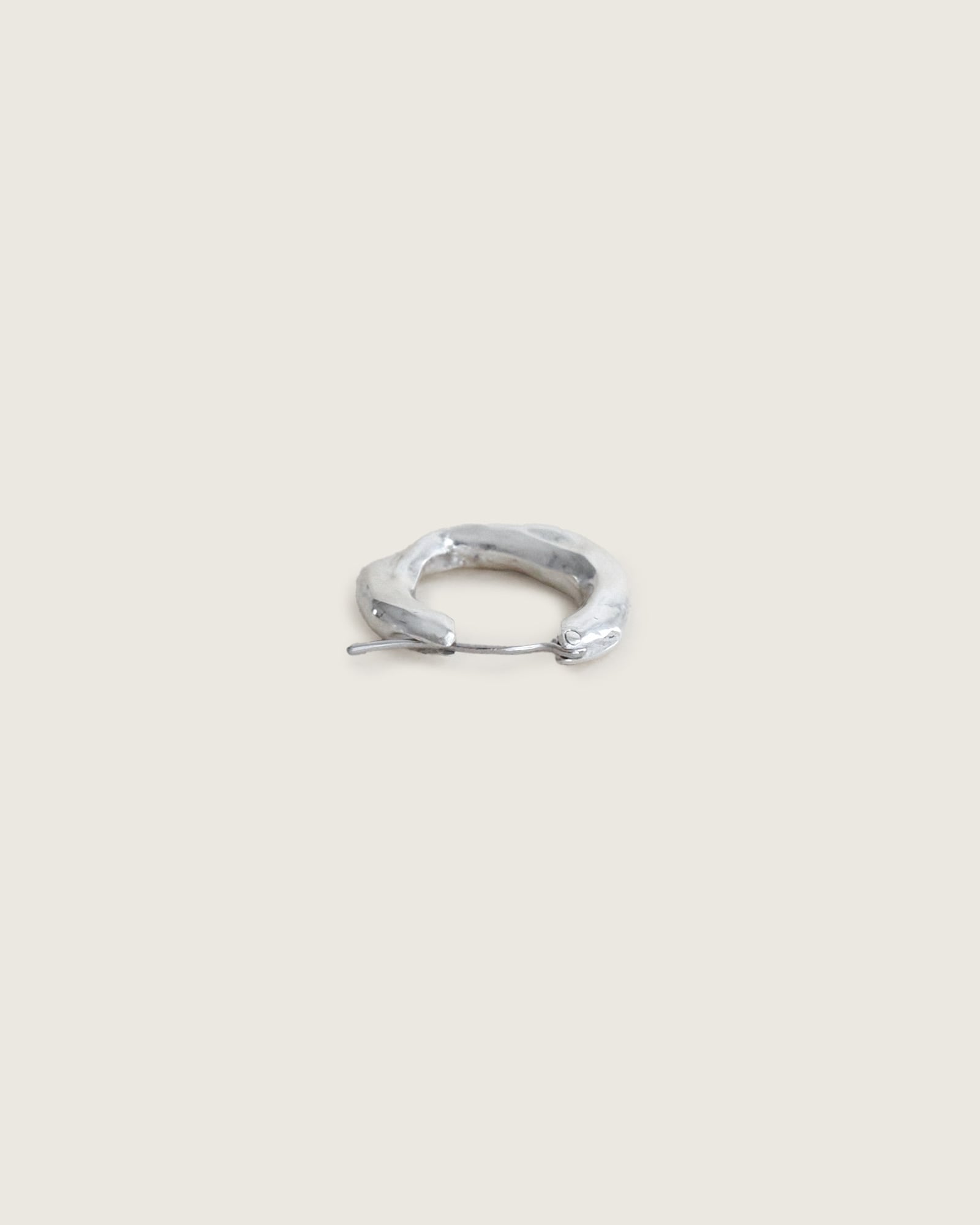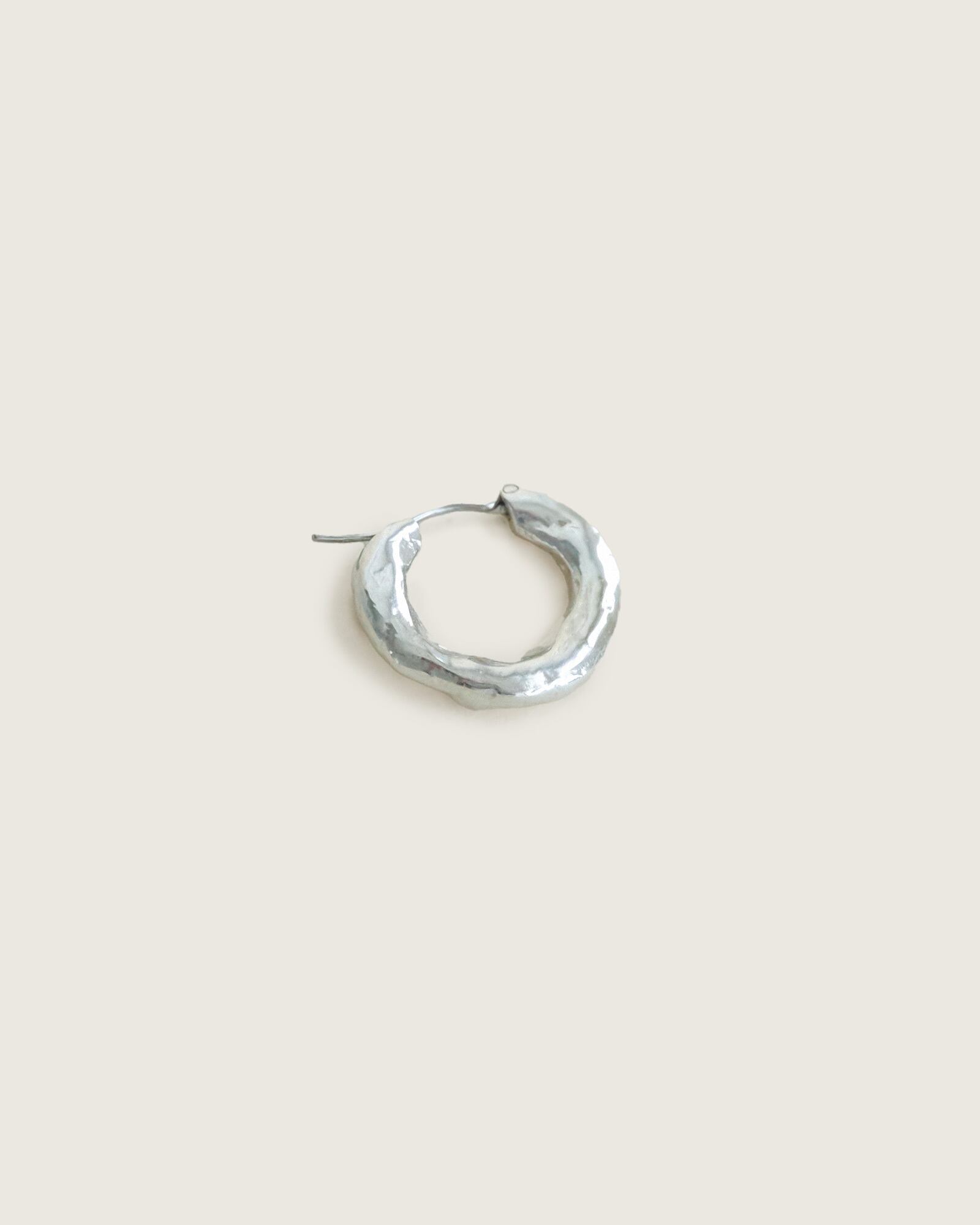 使いやすい大きさのフープピアスですが、いびつで有機的なテクスチャを与えることで、他とは少し違った表情に。クロッシングタイプで着脱が簡単で落ちにくく、実用的なのもポイント。ほどよいボリュームで、毎日着けたくなるデザインです。
