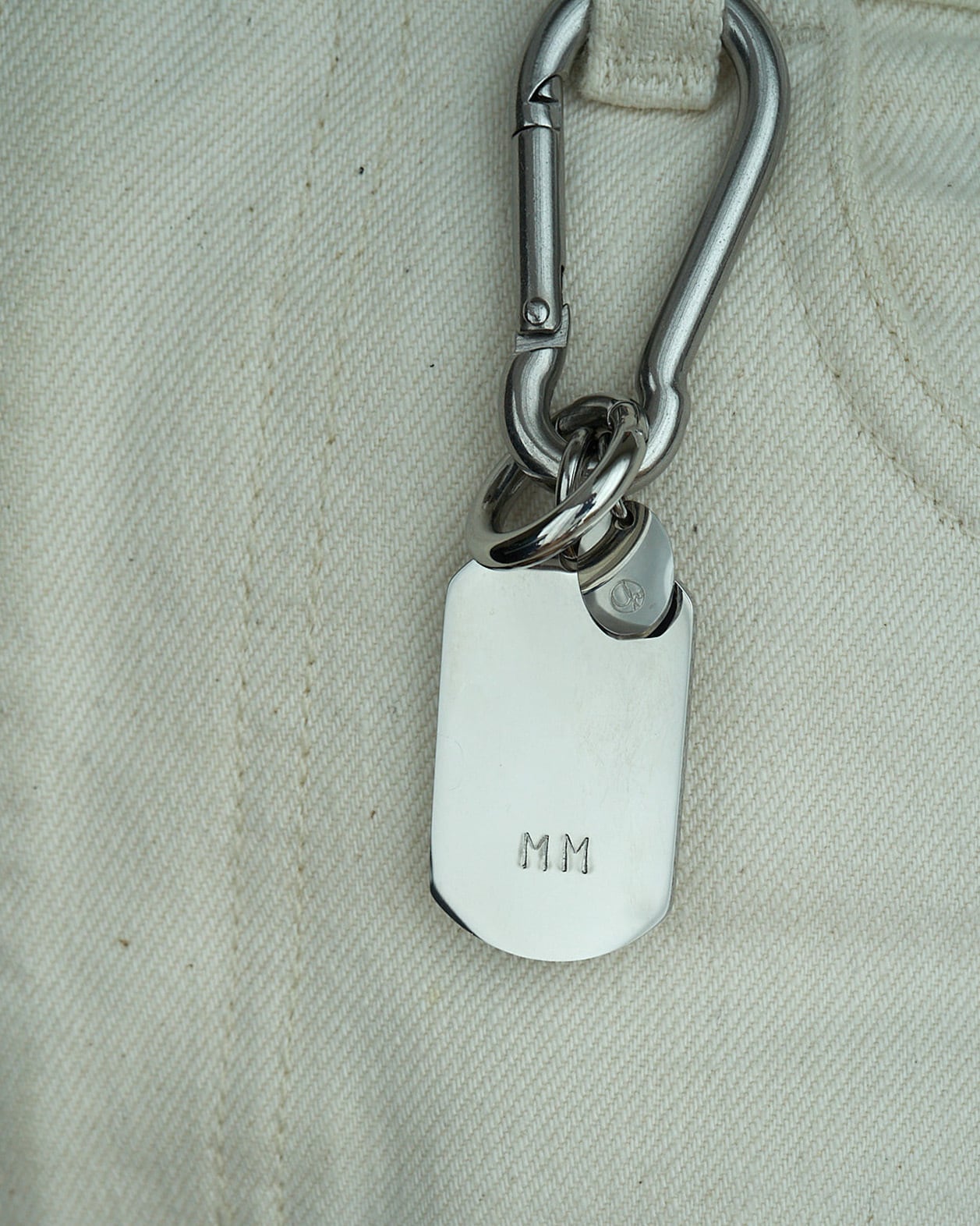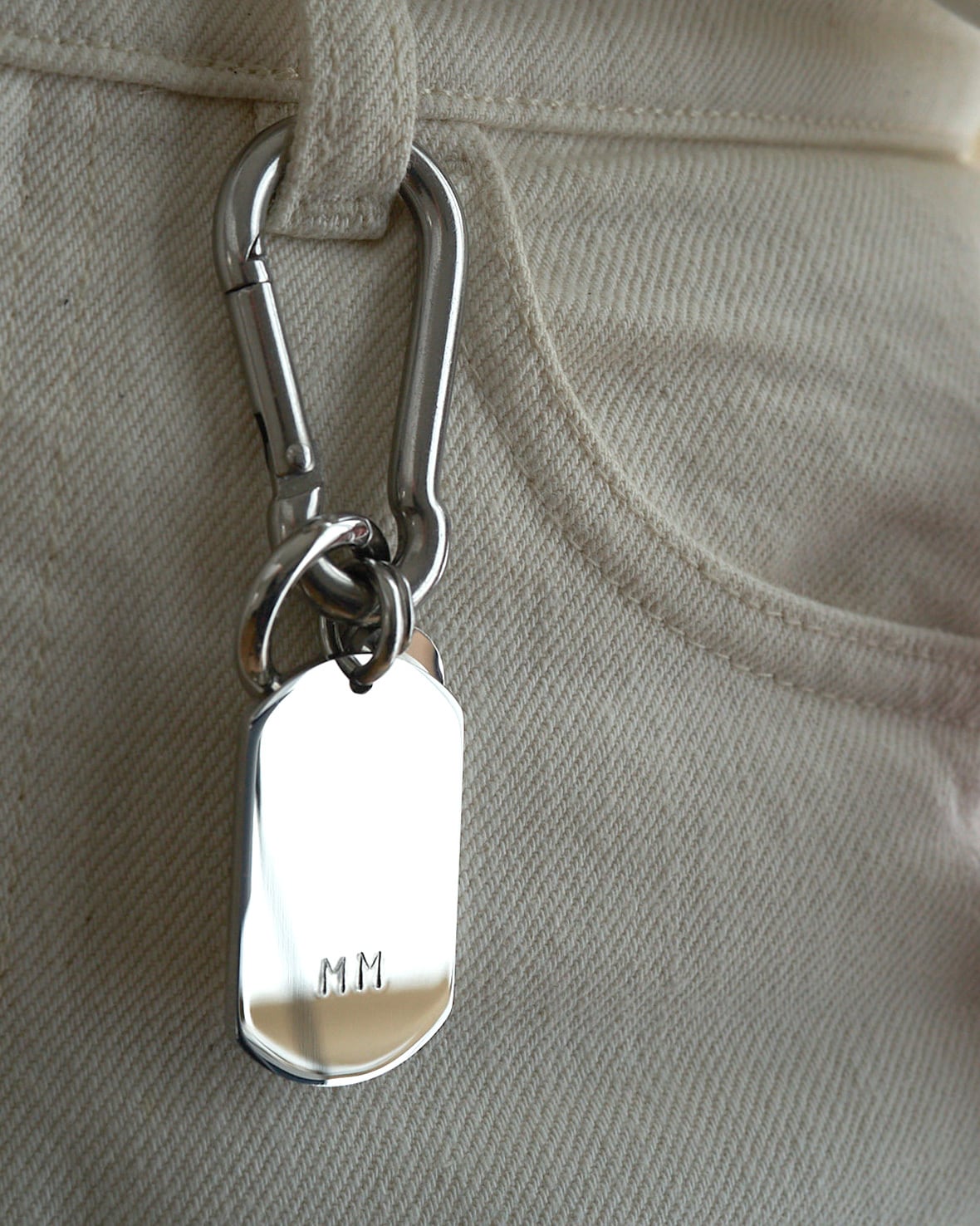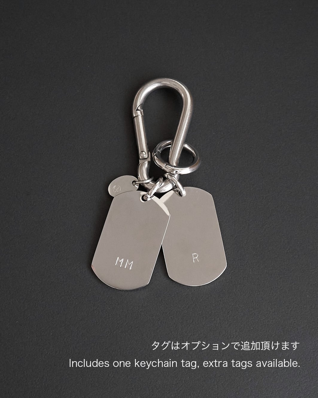 お好みでイニシャルを刻印できる、人気のカスタムタグシリーズ。シンプルながらインパクトのある大きめのタグとカラビナを使用しました。お好みのキーホルダーをつけたり、ベルトループやバッグにつけてアクセサリーのようにお使いいただけます。