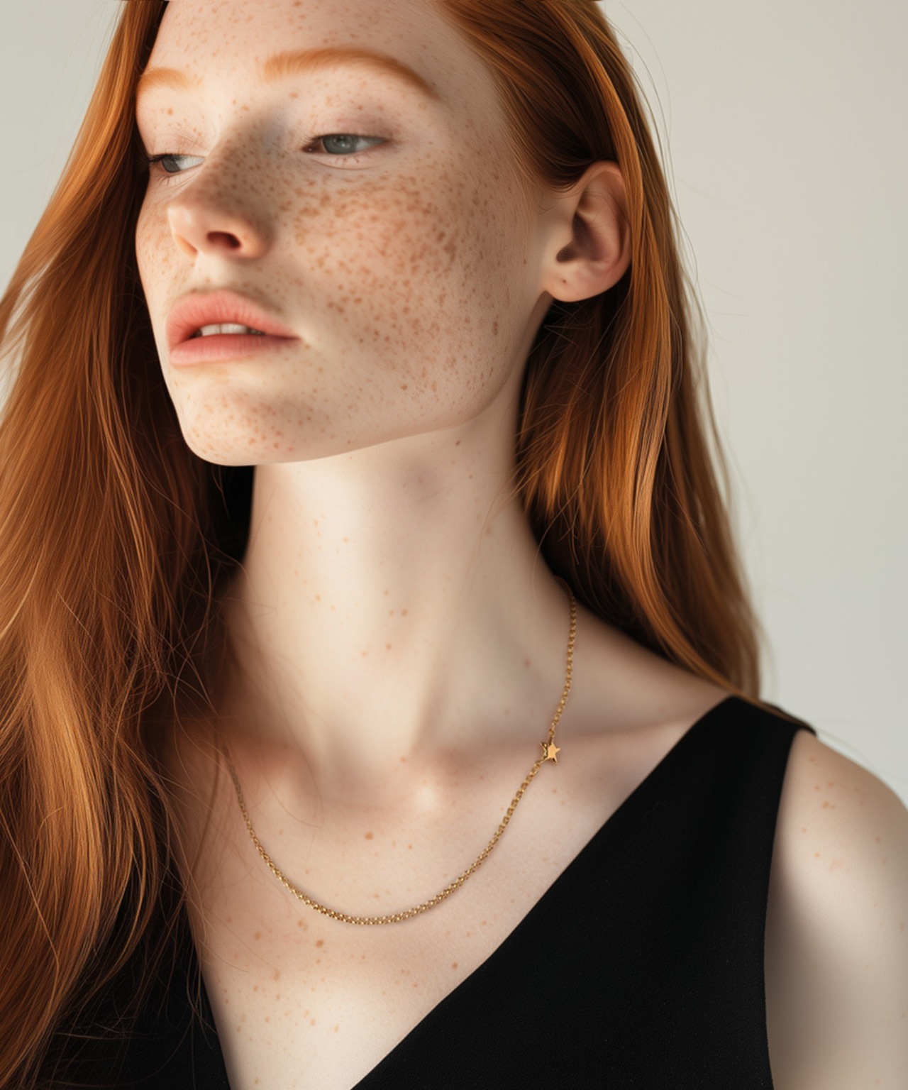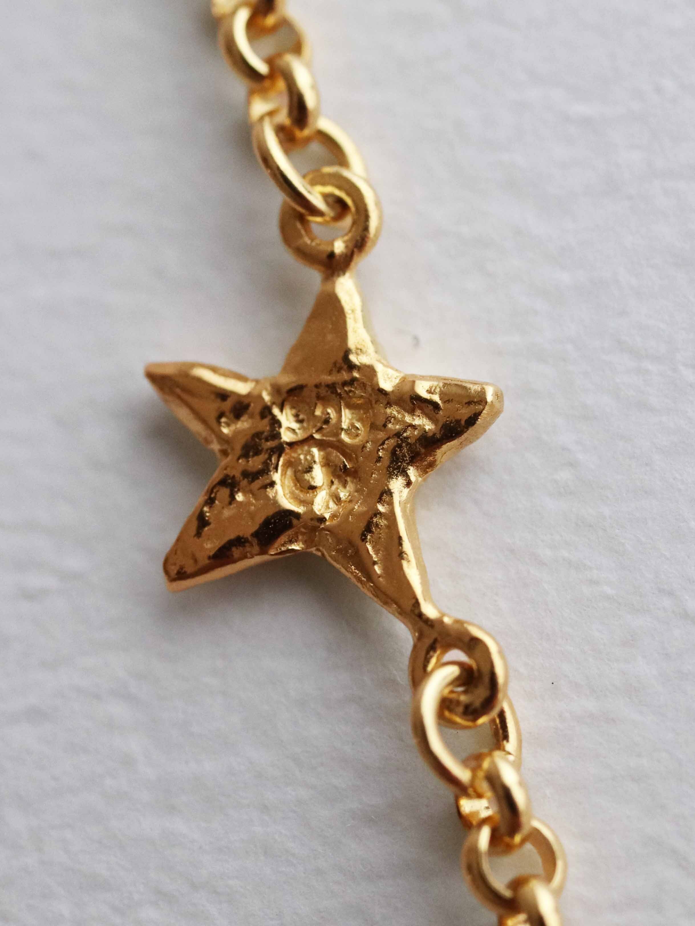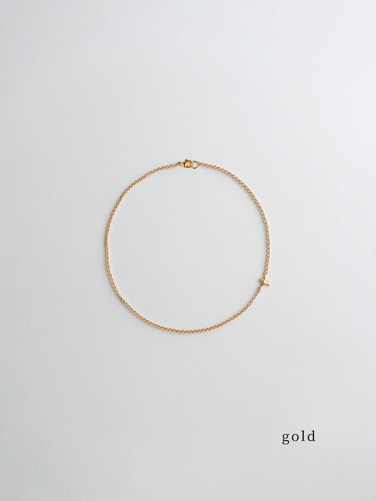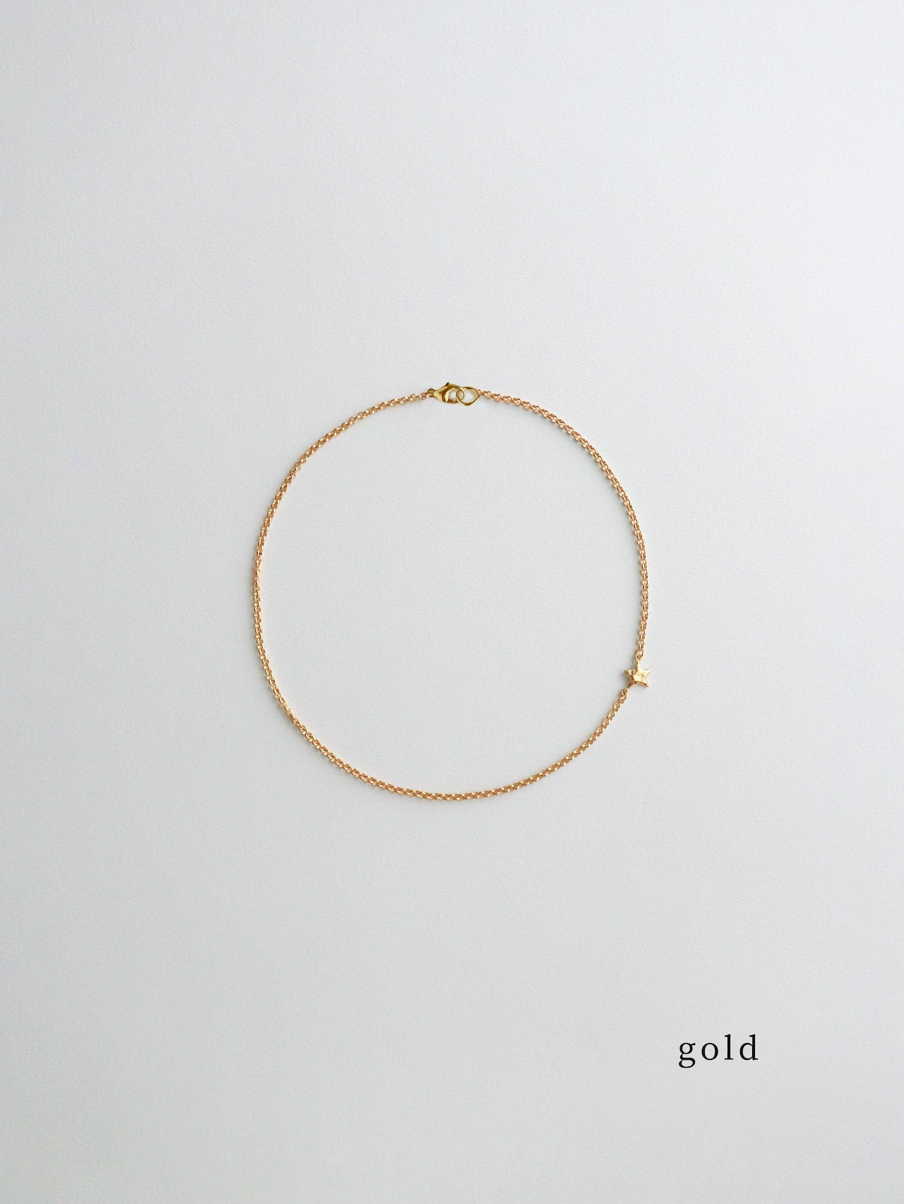 いびつな形と、テクスチャーのある表面感のスターモチーフは、デザイナー自身による造形。ペンダントというよりはチェーンネックレスとしてお使いいただけるよう、モチーフのサイズにこだわり、センターではなくサイドにモチーフを配置。1本でも、重ね付けにも重宝するアイテムです。