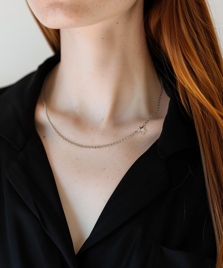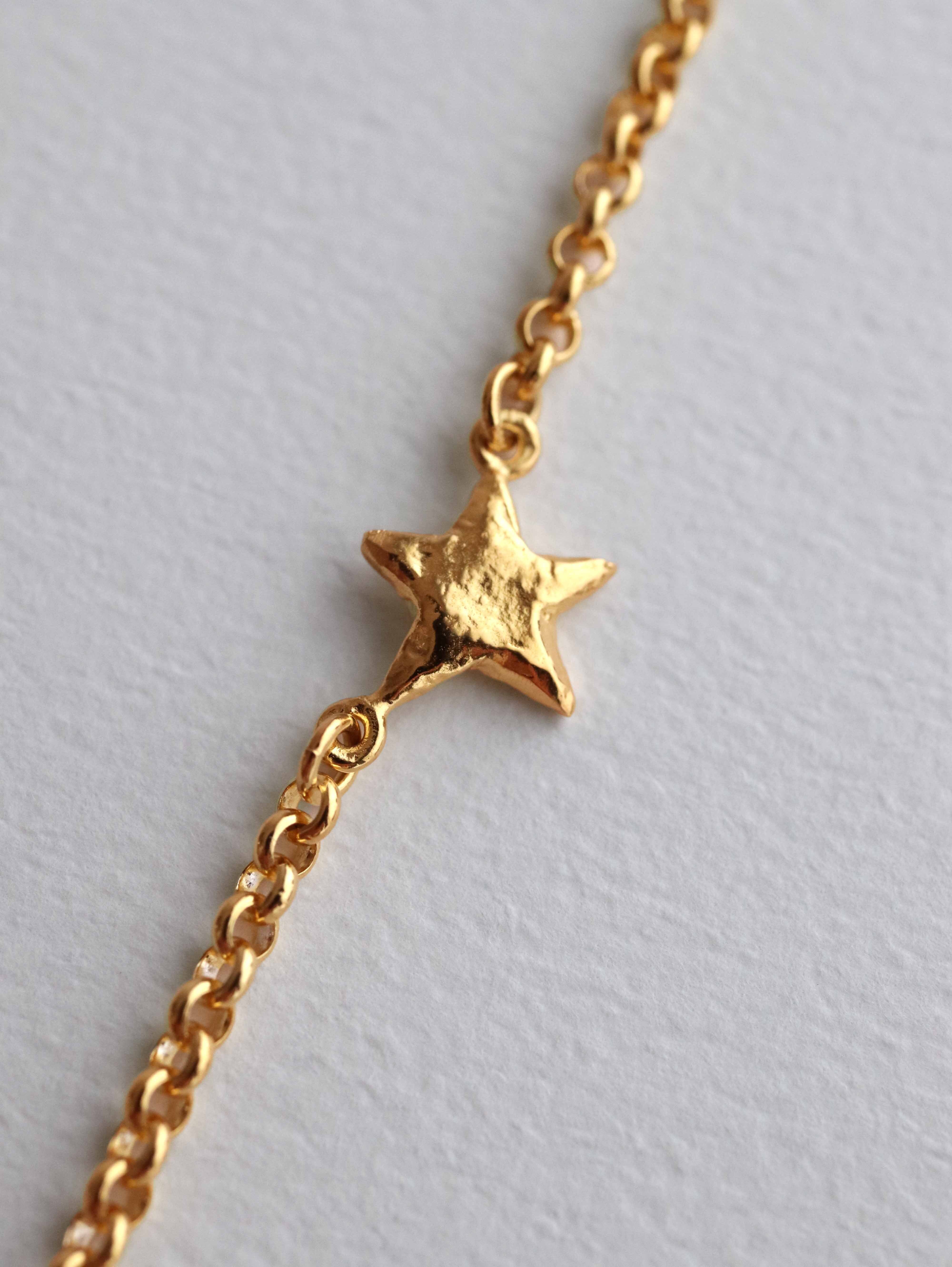 いびつな形と、テクスチャーのある表面感のスターモチーフは、デザイナー自身による造形。ペンダントというよりはチェーンネックレスとしてお使いいただけるよう、モチーフのサイズにこだわり、センターではなくサイドにモチーフを配置。1本でも、重ね付けにも重宝するアイテムです。