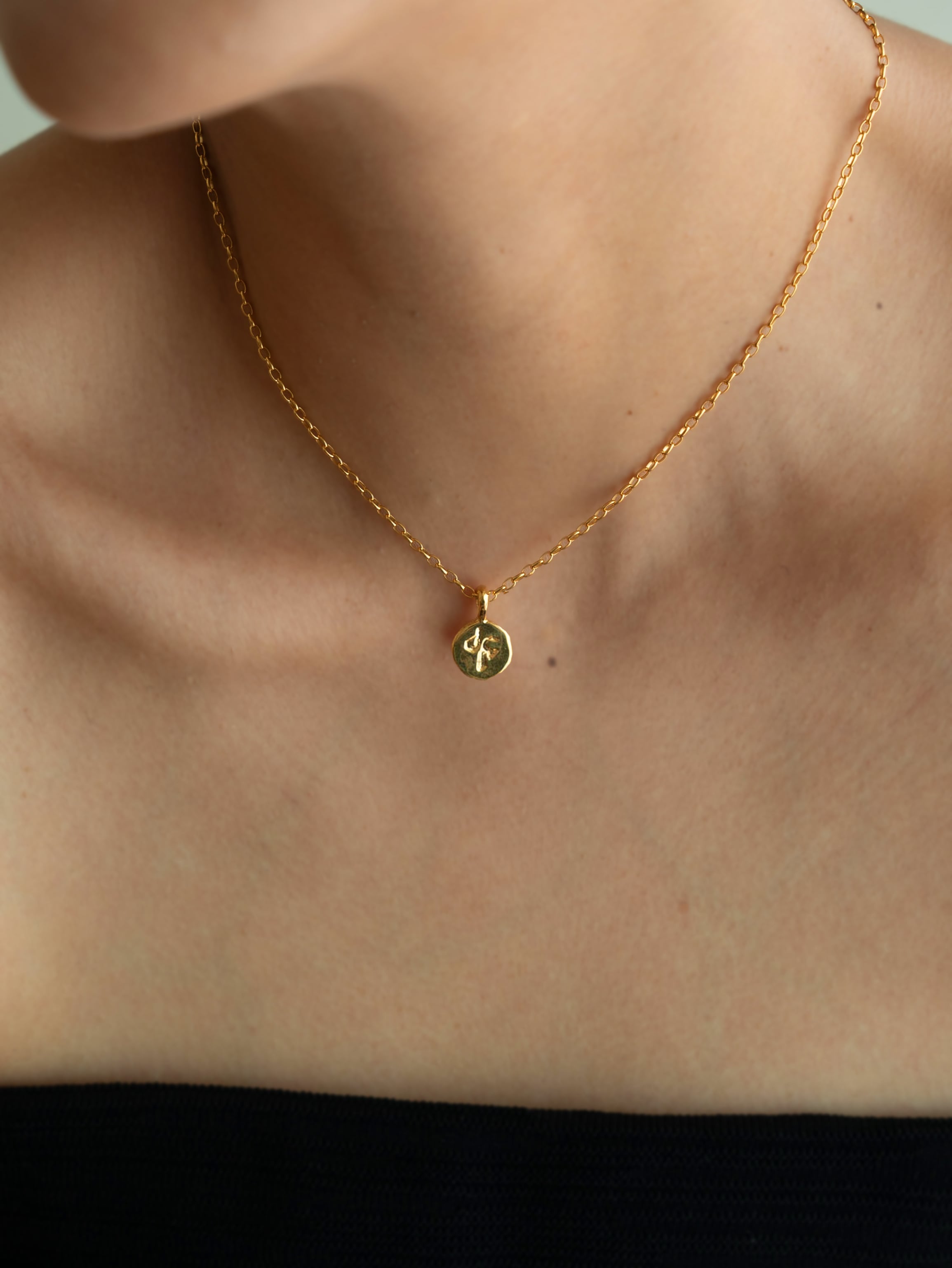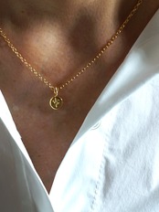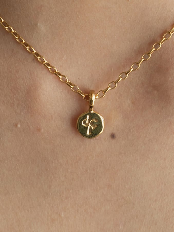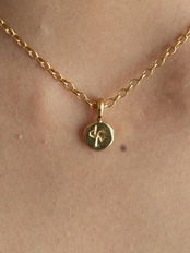 お好きな文字を刻印できるネックレス。1文字ではさりげない印象に、2文字以上の刻印ではグラフィカルな印象になります。太めのチェーンを組み合わせたこちらは、1本でもしっかりと存在感があり、華奢なネックレスとの重ね付けもお勧めです。
